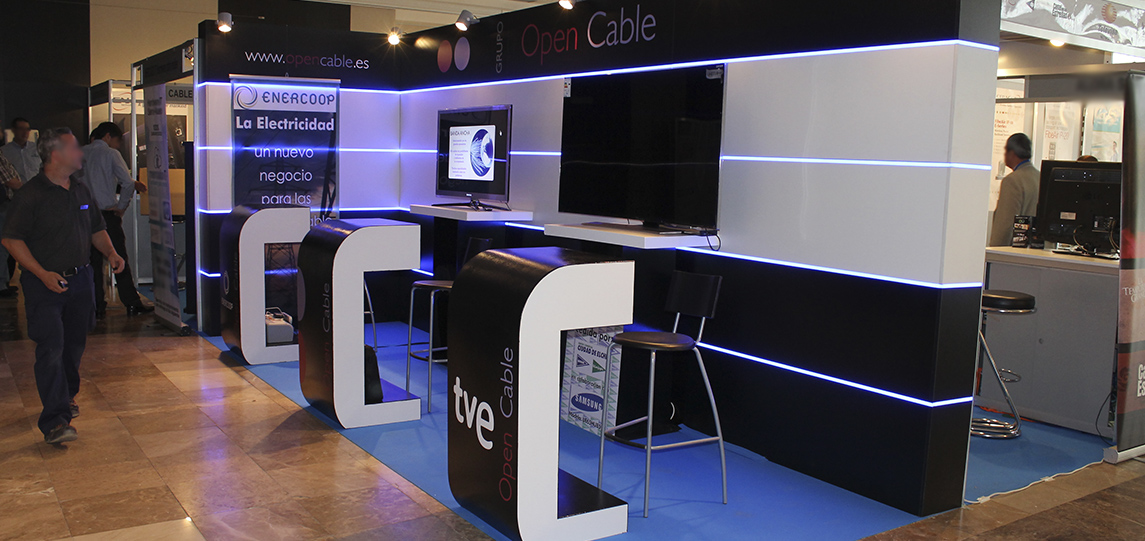 Esta combinación de líneas horizontales con tonos neutros (blancos y negros) combinados y a su vez marcando distancias entre ambos tonos con la iluminación LED en tira compone la base principal del stand de Open Cable de 2016. Completándose con el conjunto de atriles y mostradores.